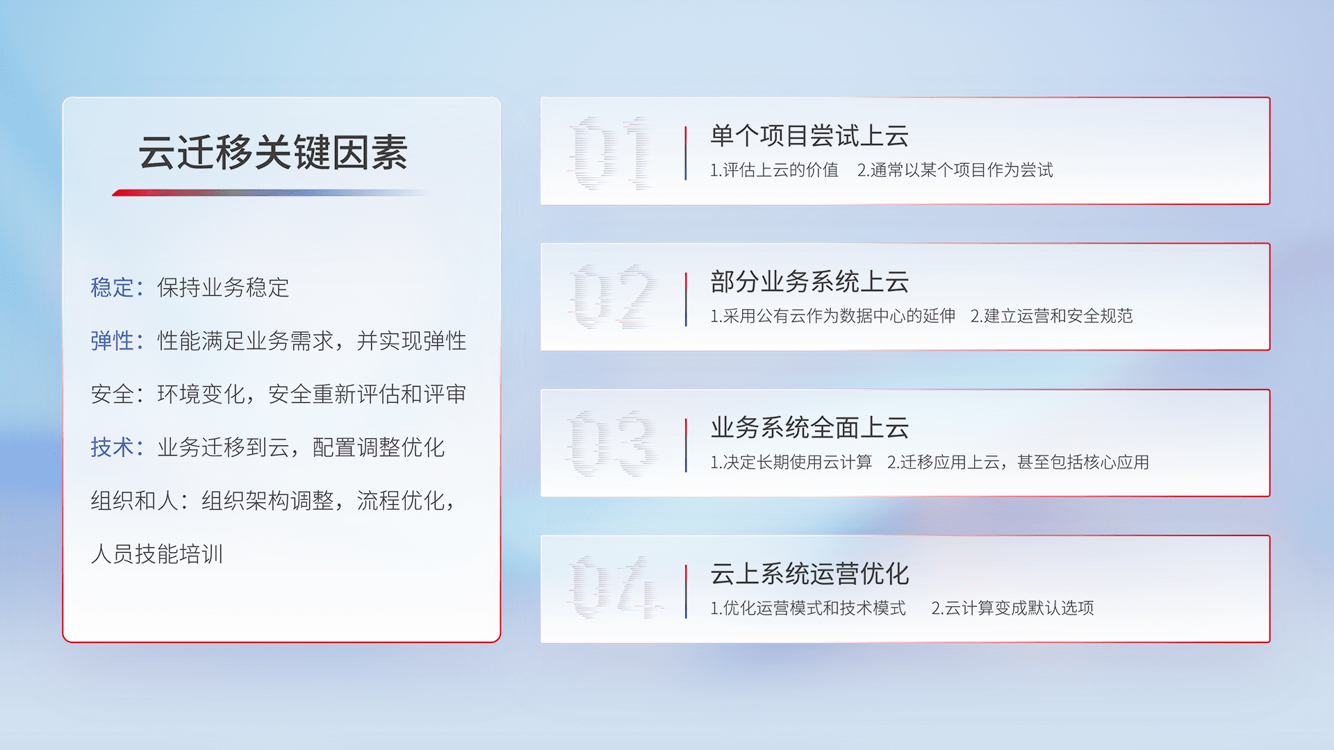 结合实际业务,,,,从规划设计、、、云平台选型、、、云原生改造、、数据迁移、、集成交付,,,,迁移全过程为客户识别最佳上云路径,,,,做好风险识别管理,,设计网络架构、、、身份权限、、、、安全审计合规、、、、操作审计、、、日志审计、、监控告警策略、、多站点容灾设计等,,,对云上基础设施进行整体规划,,,,提升IT治理水平,,以满足弹性、、、、高可用、、高性能的需求。。。。